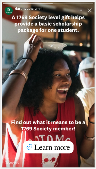 Paid social: Pilot campaign to increase awareness and membership in the “1769 Society,” a giving society for alumni, family members and friends who make annual gifts of $2,500 to the Dartmouth College Fund. Resulted in 4 gifts (at $2,500-level) with 350% ROAS.